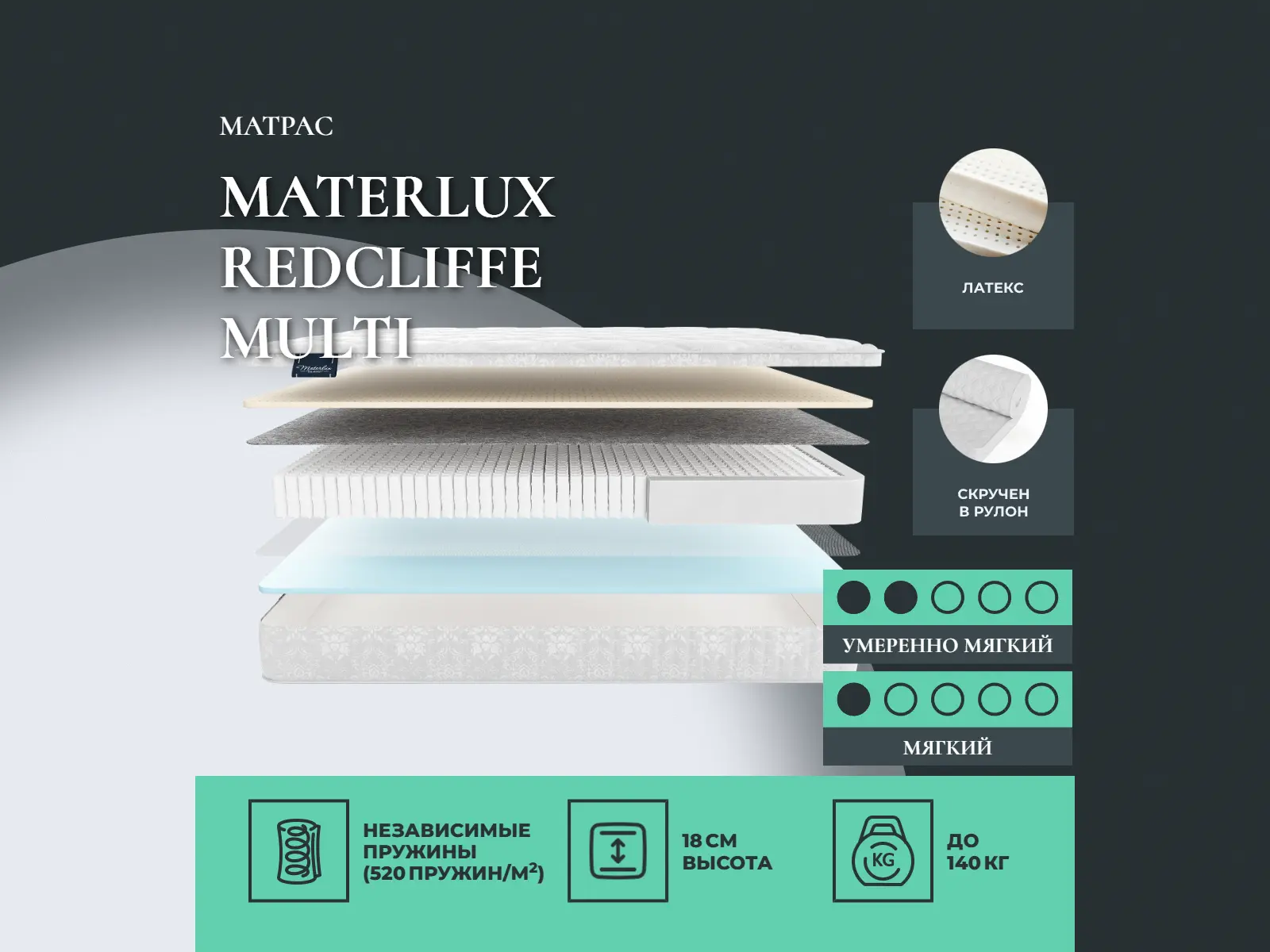 Преимущество матраса Redcliffe Multi — он имеет 2 различные по жесткости стороны: средне-мягкую и мягкую.