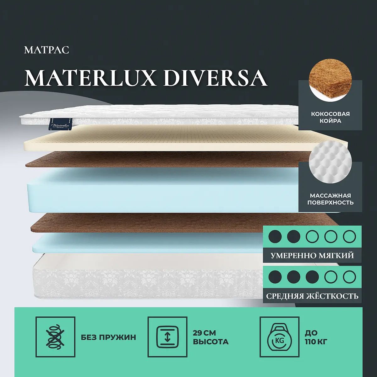 Умеренно–мягкий беспружинный матрас со стороны Эрголатекса с массажным эффектом, умеренно–жесткий со стороны пены Natural foam.Состав матраса: