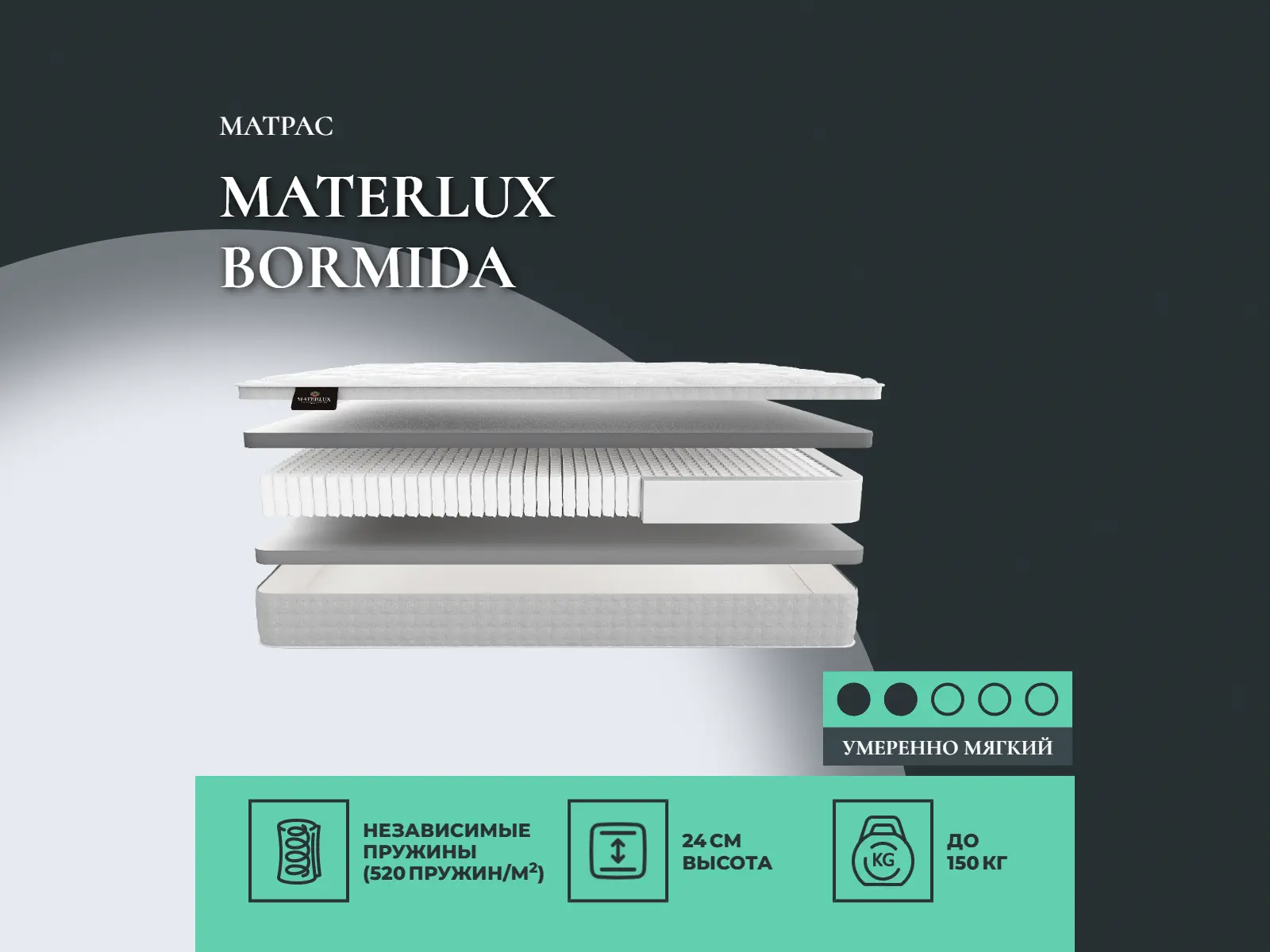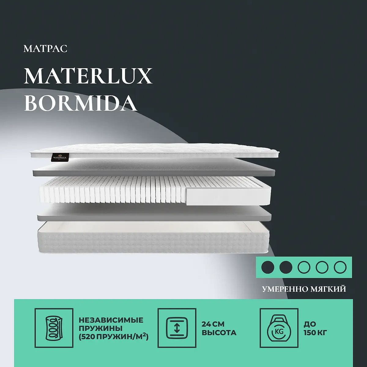 Средне-мягкий матрас «Materlux Bormida» — для истинного ценителя комфорта. Такая модель хорошо подходит людям с небольшим весом.