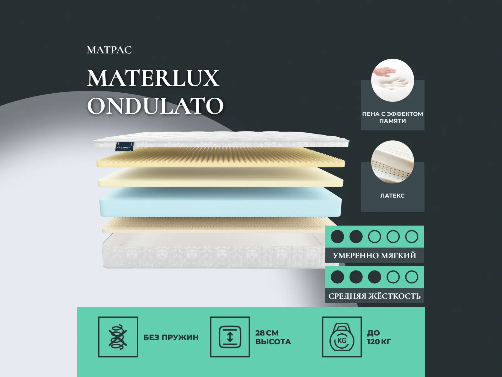 Умеренно–мягкий матрас со стороны эрголатекса с массажным эффектом и материала с эффектом памяти, средне–жесткий со стороны латекса.Состав матраса: