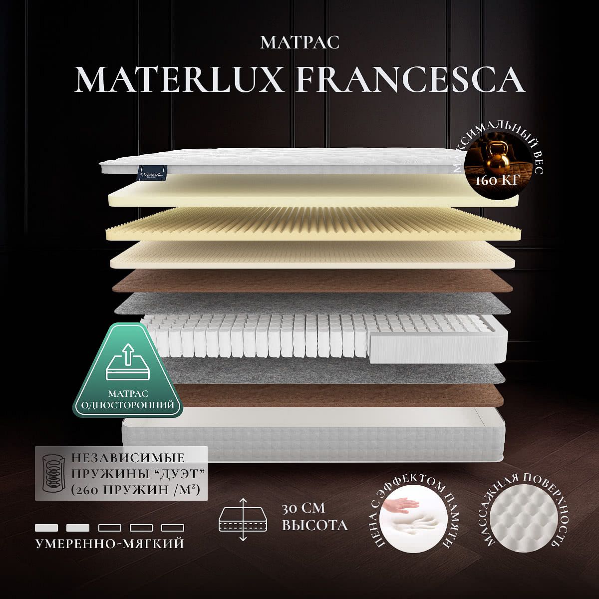 Преимущество матраса Francesca — он не требует переворачивания, поскольку имеет только одну рабочую сторону.