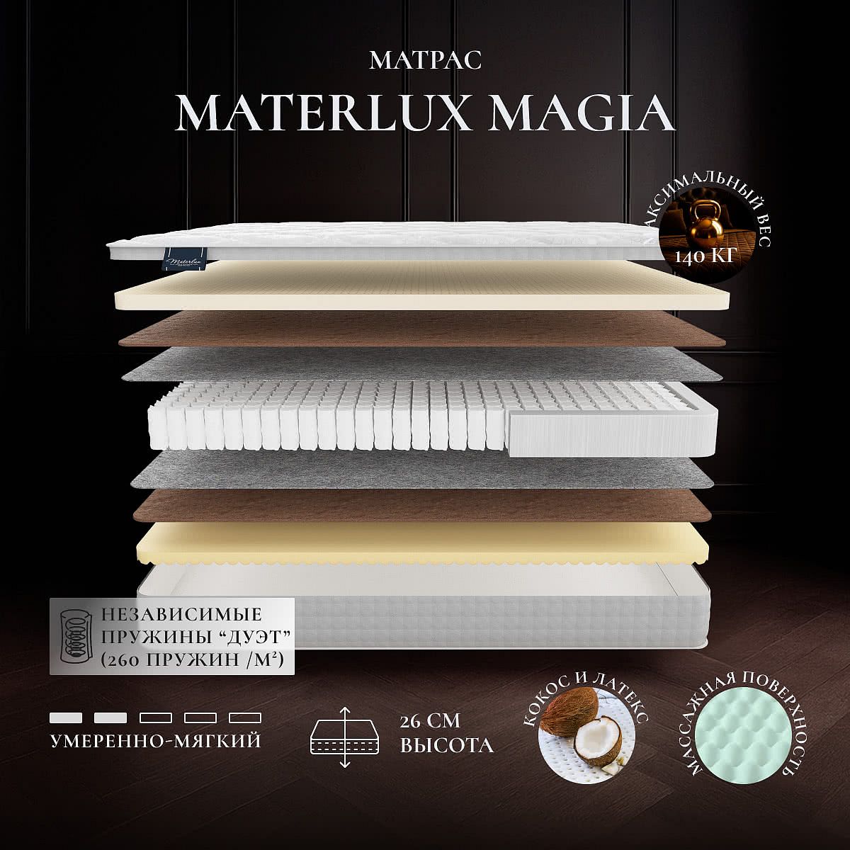 Средне-мягкий матрас «Materlux Magia» — для истинного ценителя комфорта. Такая модель хорошо подходит людям с небольшим весом.