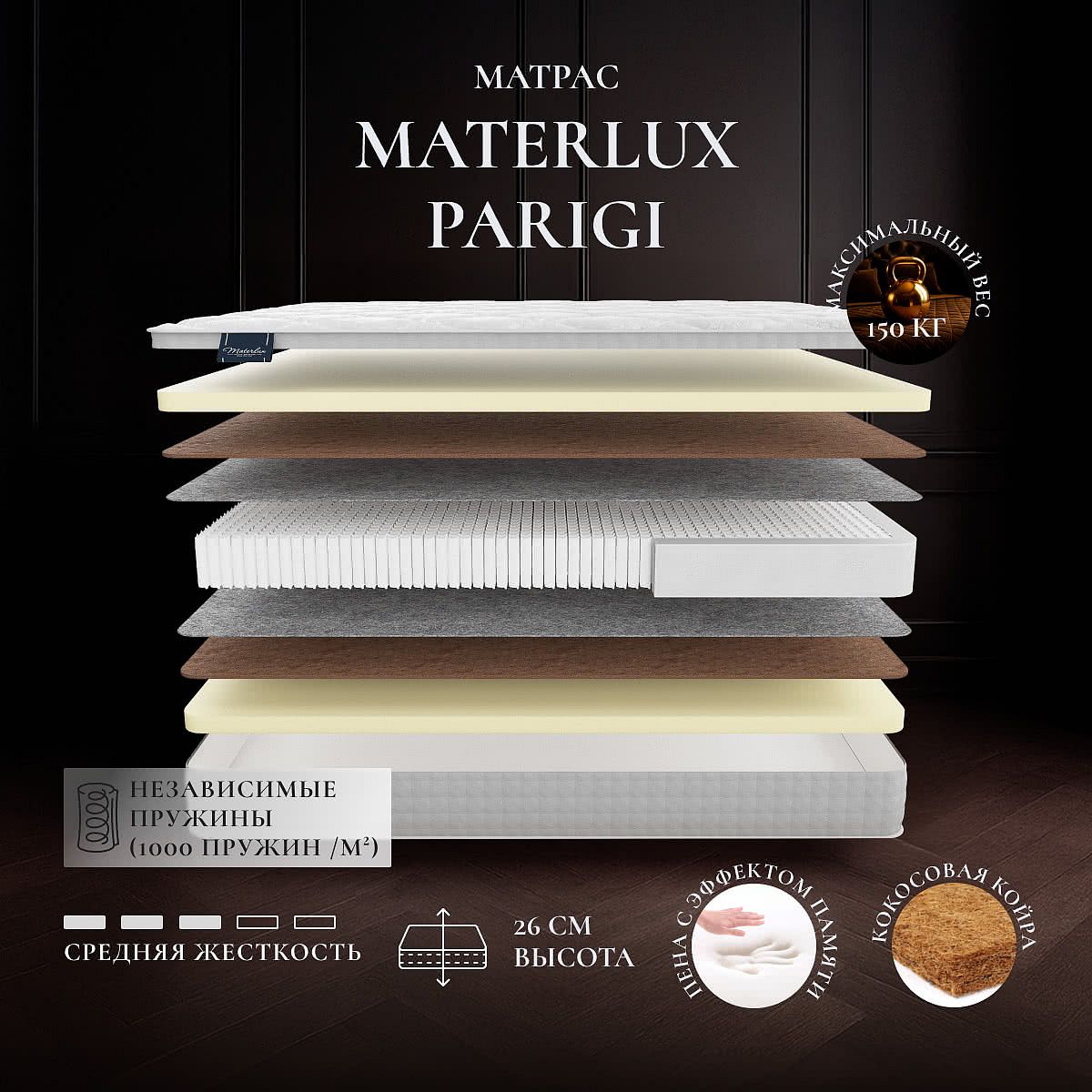 Матрас «Materlux Parigi» — средней жесткости, которая подходит большинству людей среднего телосложения. Это — оптимальный вариант и детям, и взрослым, и пожилым людям.
