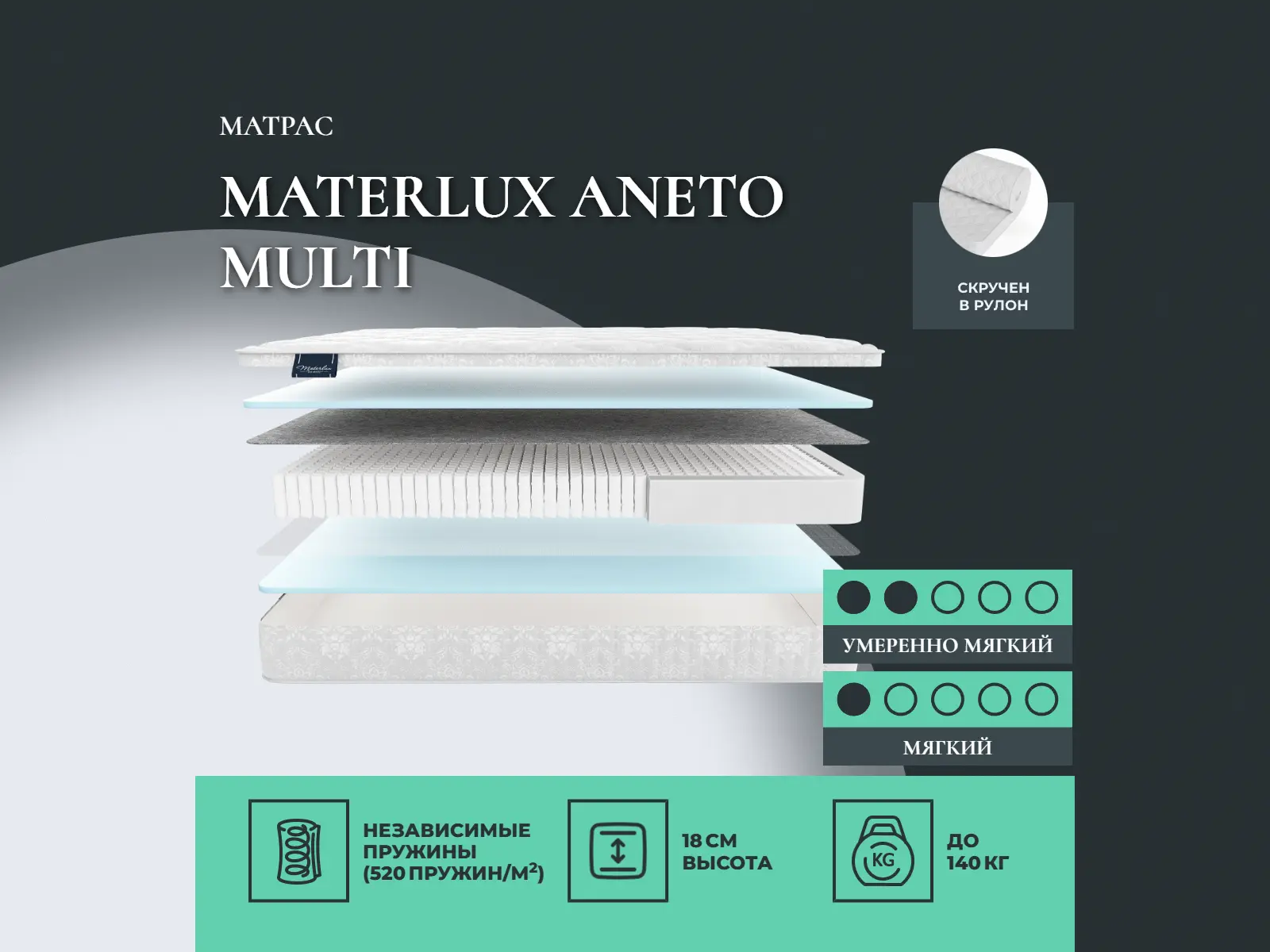 Матрас Aneto Multi может доставляться как в полноразмерном виде, так и в скрученном. Данный матрас можно свернуть на фабрике в плотный рулон. Скрученный матрас удобно перевезти на дачу или просто забрать из магазина. Свернуть матрас повторно так же компактно в домашних условиях невозможно.
