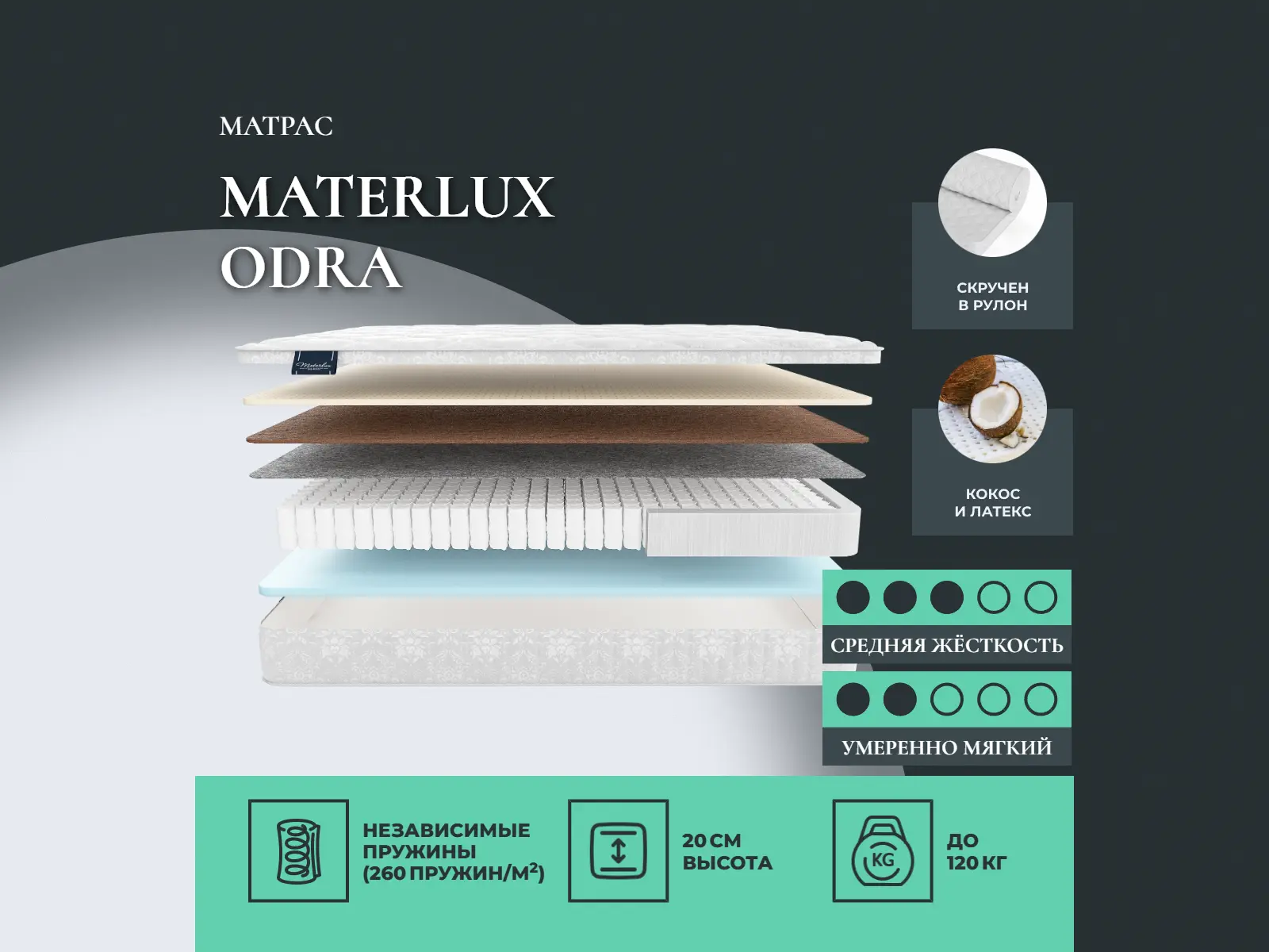 Кокос — натуральный материал, койра отлично дышит, придает матрасу «Odra» жесткость и упругость.