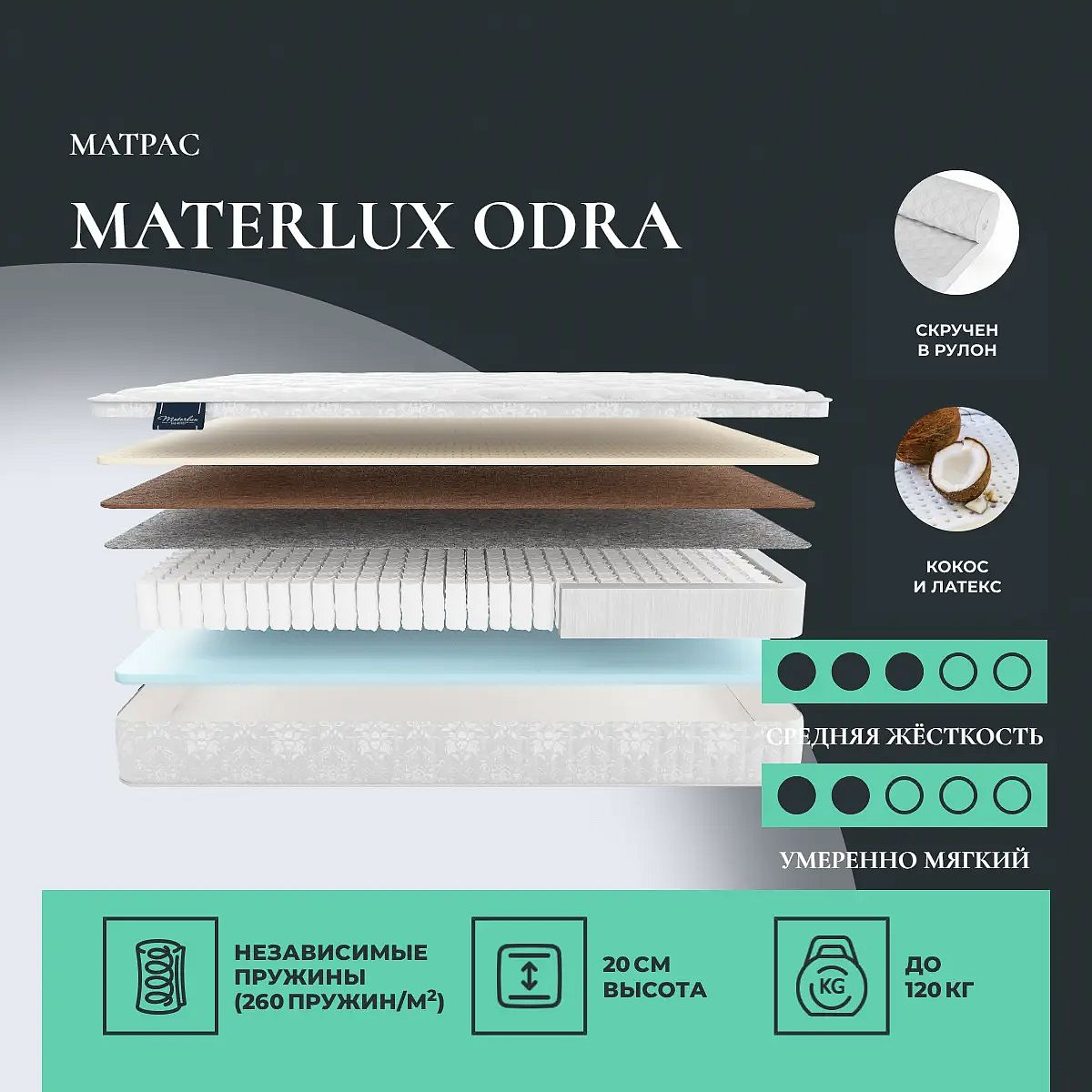 Максимальная нагрузка на спальное место: до 120 кг. Высота матраса: 20 см. По умолчанию матрас поставляется в полном размере. По Вашему желанию матрас может быть доставлен в скрученном виде. Это необходимо указать при оформлении заказа.
