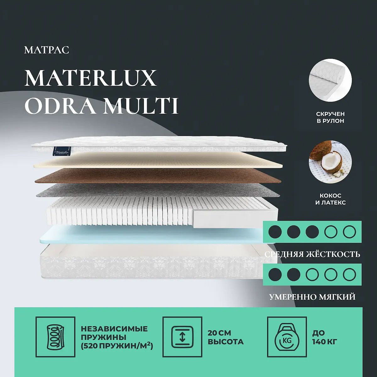 Кокос — натуральный материал, койра отлично дышит, придает матрасу «Odra Multi» жесткость и упругость.