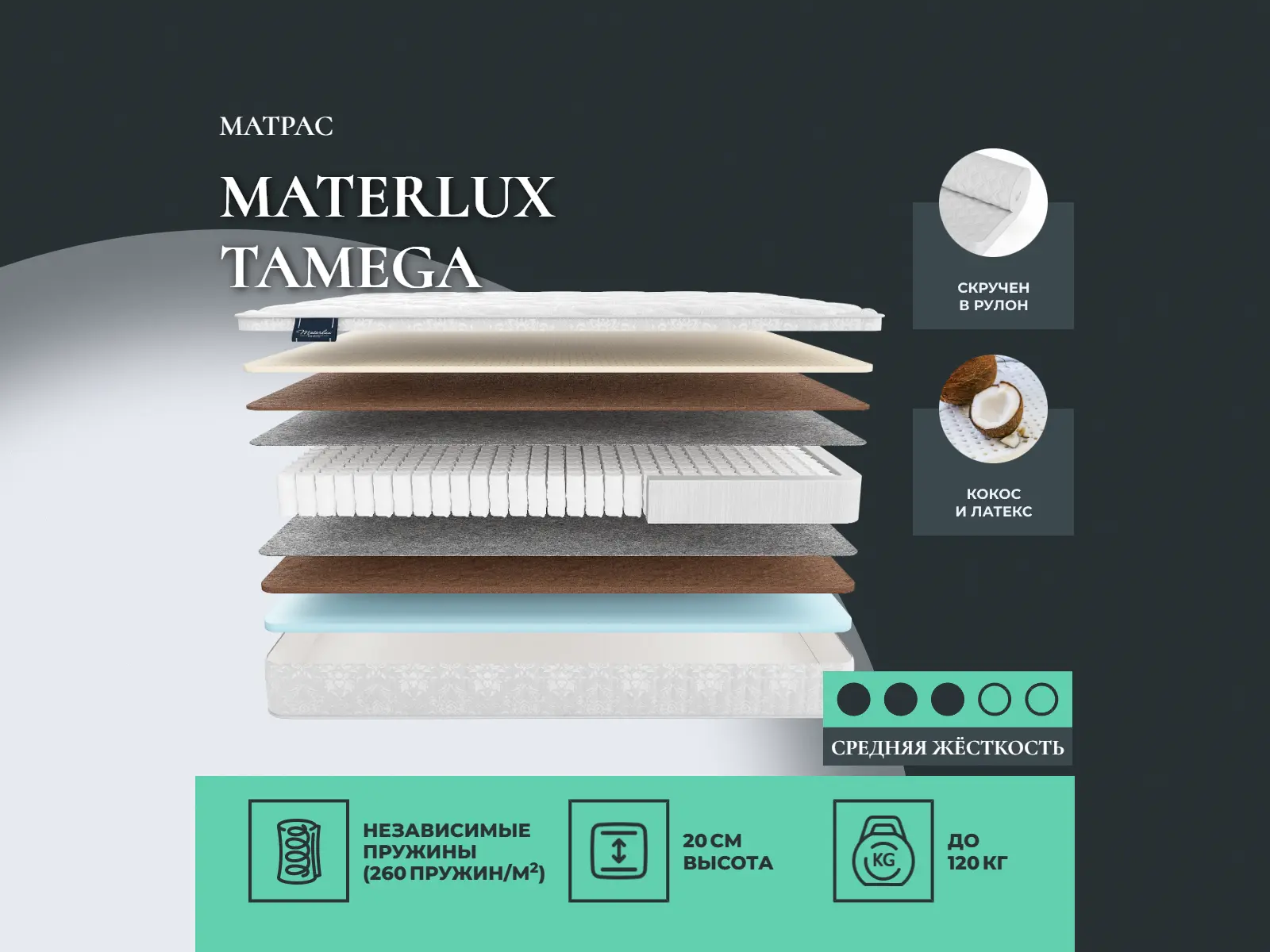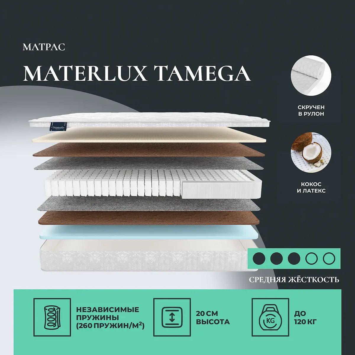 Кокос — натуральный материал, койра отлично дышит, придает матрасу «Tamega» жесткость и упругость.