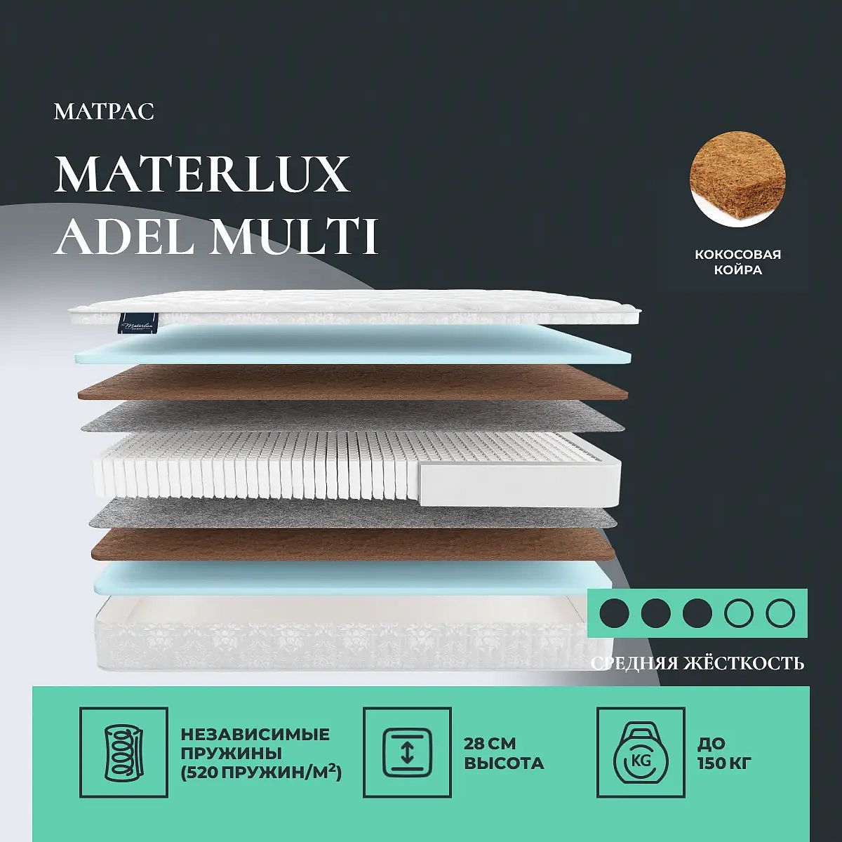 Кокос — натуральный материал, койра отлично дышит, придает матрасу «Adel Multi» жесткость и упругость.