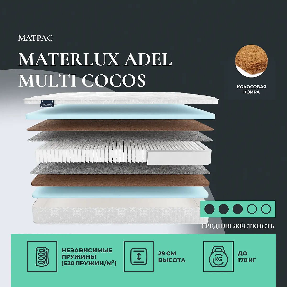 Матрас «Materlux Adel Multi Cocos» — средней жесткости, которая подходит большинству людей среднего телосложения. Это — оптимальный выбор и детям, и взрослым, и пожилым людям.