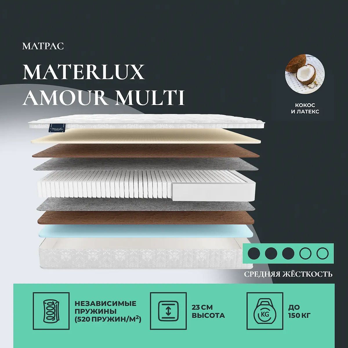 Кокос — натуральный материал, койра отлично дышит, придает матрасу «Amour Multi» жесткость и упругость.