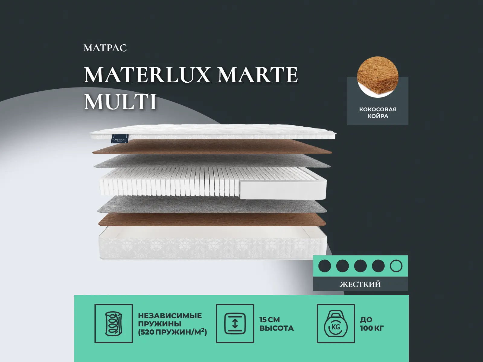 Кокос — натуральный материал, койра отлично дышит, придает матрасу «Marte Multi» жесткость и упругость.