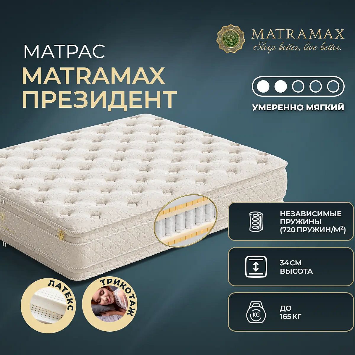 Средне-мягкий матрас «Matramax Президент» просто создан для истинного ценителя комфорта. Такая модель отлично подойдет людям с небольшим весом.