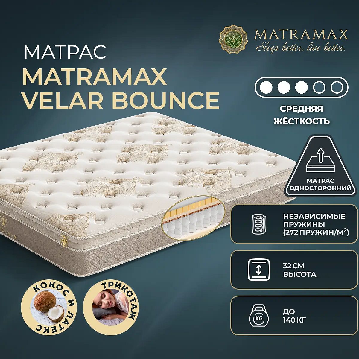 Односторонний средне-жесткий матрас Matramax Velar Bounce – это матрас ручной работы, выполненный с вниманием к каждой детали, и обеспечивающий комфортный сон, долговечность и эстетичный внешний вид.Состав матраса: