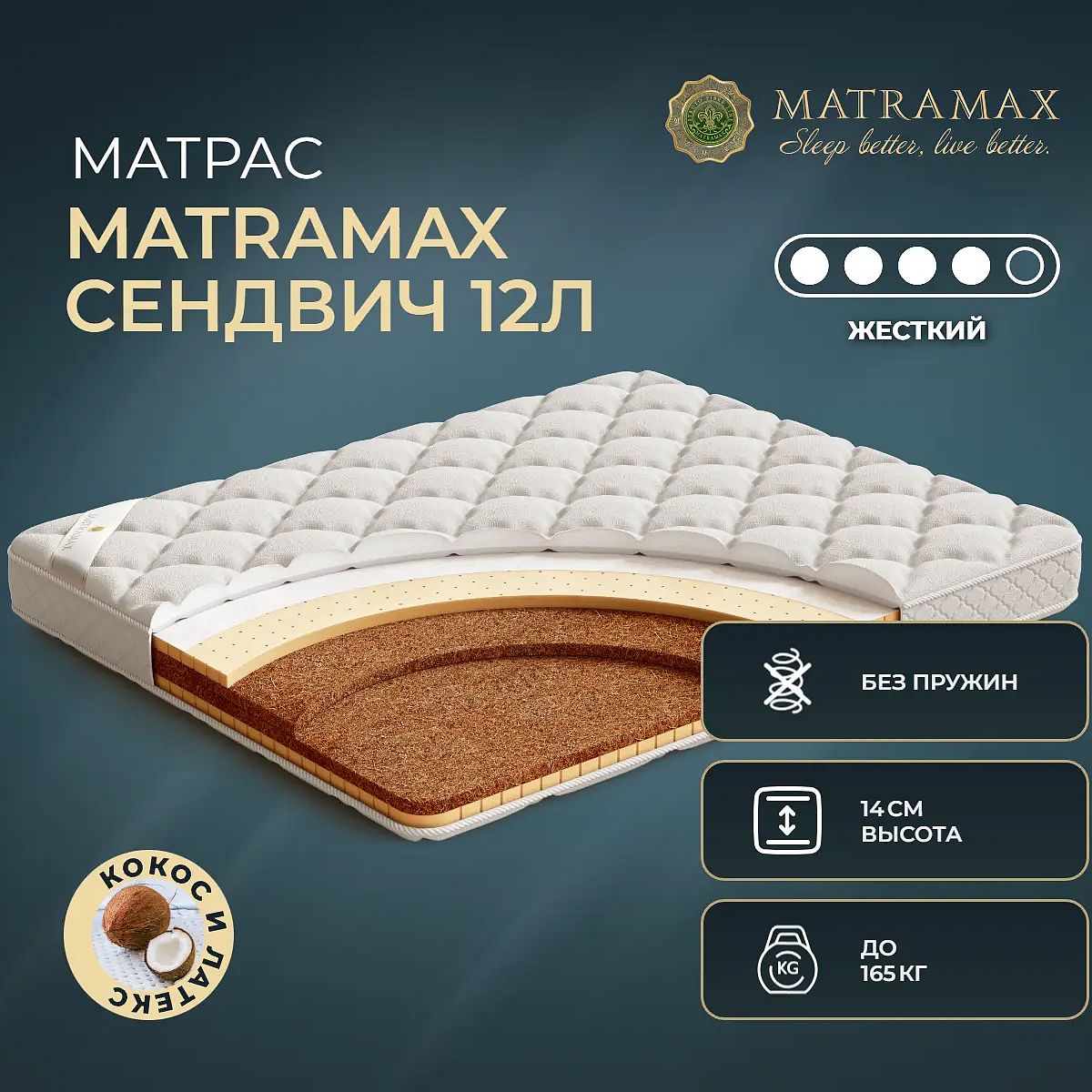 Матрас высокой жесткости «Matramax Сендвич 12 Л» — оптимальный выбор для уверенной поддержки позвоночника. Именно такие модели обычно рекомендуют подросткам, спортсменам или людям с проблемами позвоночника.