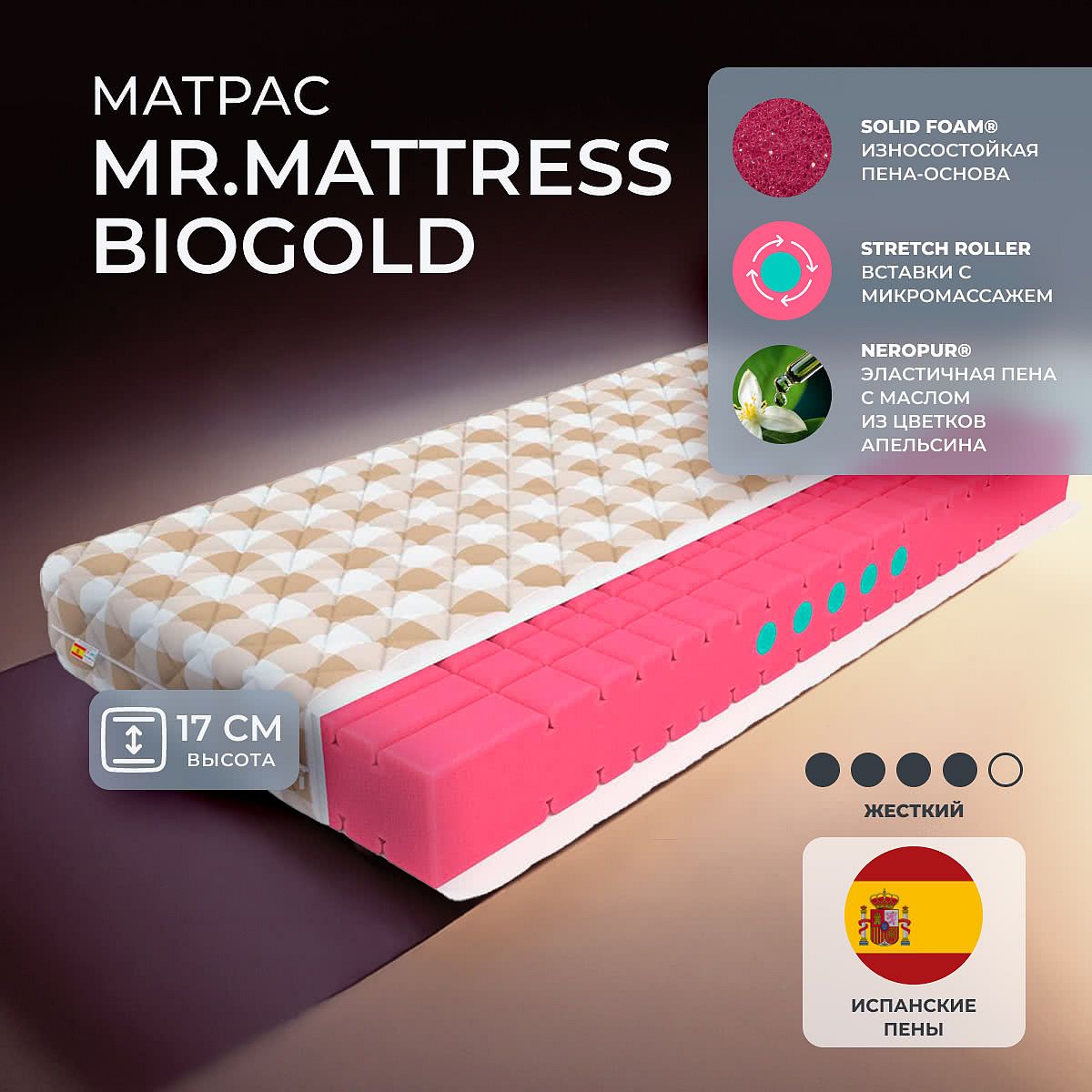 Матрас высокой жесткости «Mr.Mattress BioGold» — оптимальный выбор для уверенной поддержки позвоночника. Именно такие модели обычно рекомендуют подросткам, спортсменам или людям с проблемами позвоночника.
