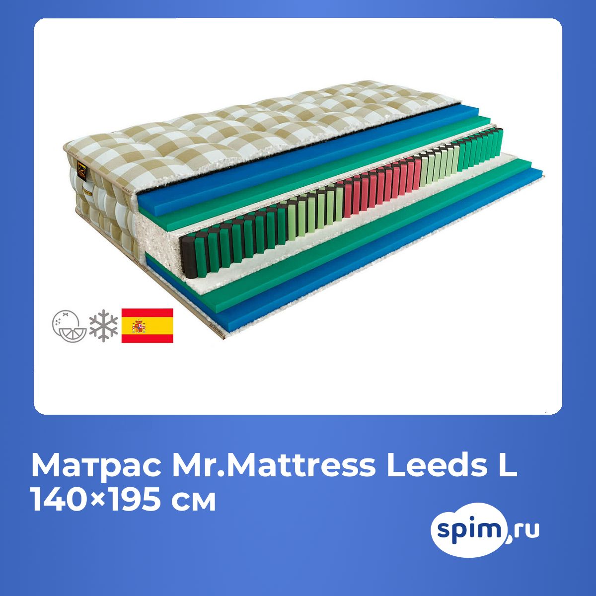 Максимальный вес на спальное место, кг: 130. Высота, см: 34. Бесклеевая технологияЭта модель изготавливается без использования клея. Все слои сшиваются друг с другом при помощи специальной иглы и капроновых нитей. Это позволяет им не смещаться во сне под телом спящего, следовательно, заметно увеличивает износостойкость всего изделия. Это так называемая технология тафтинга.Особенности работы пружинВ основе модели – анатомический блок пружин Hypnotic. Диаметр проволоки здесь – всего 2 мм, что заметно увеличивает износостойкость всей конструкции. А также два вида пружин, которые располагаются поочередно друг с другом: стальные пружины и пружины из соевой пены. Использование такого блока положительно влияет на здоровье спящего и позволяет его телу принимать естественные позы во время сна и максимально расслабляться. По обеим сторонам от блока проложены слои из натуральной шерсти. Шерсть защищает слои и регулирует температуру на спальной поверхности.Наполнение моделиВ качестве наполнения используются два вида соевой пены – пена с экстрактом цветка дикого апельсина Neropur Foam и вязкоэластичная пена Viscool с охлаждающим эффектом. Neropur Foam обеспечивает упругую поддержку для всего тела, обладает расслабляющим действием. Viscool способна принимать все контуры тела и запоминать их, оставляя след на спальной поверхности. Обе пены гипоаллергенные и не имеют запаха. Материалы отлично пропускают воздух и регулируют температуру на поверхности.Чехол из хлопкаЧехол модели несъемный, выполнен из хлопка с добавлением шерсти.Защита матрасаДля защиты поверхности от загрязнений, попадания пыли и влаги на матрас рекомендуем купить защитный чехол или водонепроницаемый наматрасник.Другие моделиПосмотрите также другие модели серии for VIP: Mr. Mattress Leeds, Mr. Mattress Leeds XL.