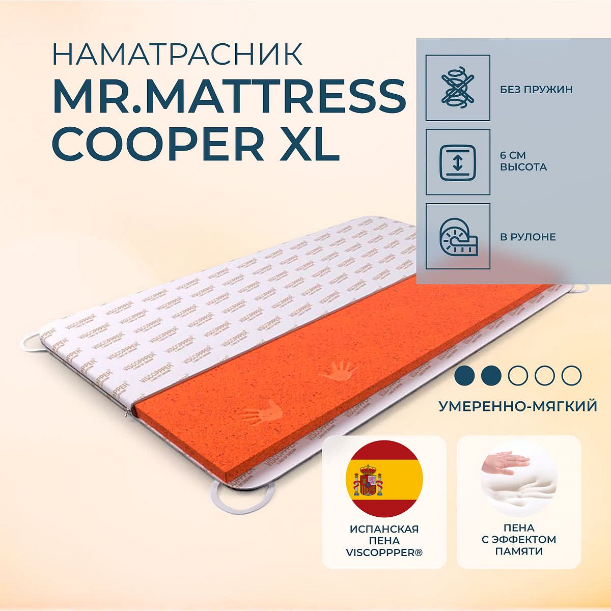Наполнитель: испанская пена Viscoppper высокой плотности 50 кг/м3. Производитель – компания «Torres Espic». Съемный чехол: трикотаж, 100% хлопок. Натуральная ткань хорошо пропускает воздух, дает Вашей коже дышать, препятствуя избыточному потоотделению. Прочный чехол поддерживает деликатный режим стирки, что придает гигиеничность и долговечность. Высота: 6 см. Тип крепления: резинки по углам. Поставляется в скрученном виде. Топпер Cooper придает комфорт спальному месту и защищает регенерирующие процессы организма во время сна от вредных и опасных радиационных низкочастотных излучений вездесущих смартфонов, телефонов, LED – оборудования, телевизоров и других современных девайсов. Инновационный наматрасник Cooper – это безопасный и здоровый сон, бодрость и счастливое долголетие. Микропористая структура пены Viscoppper имеет повышенную воздухопроницаемость, что благотворно влияет на температурный баланс тела. Микроциркуляция воздуха способствует гигиенической свежести основного матраса. Упругая анатомическая плотная пена Viscoppper из 100% соевого масла обеспечивает: