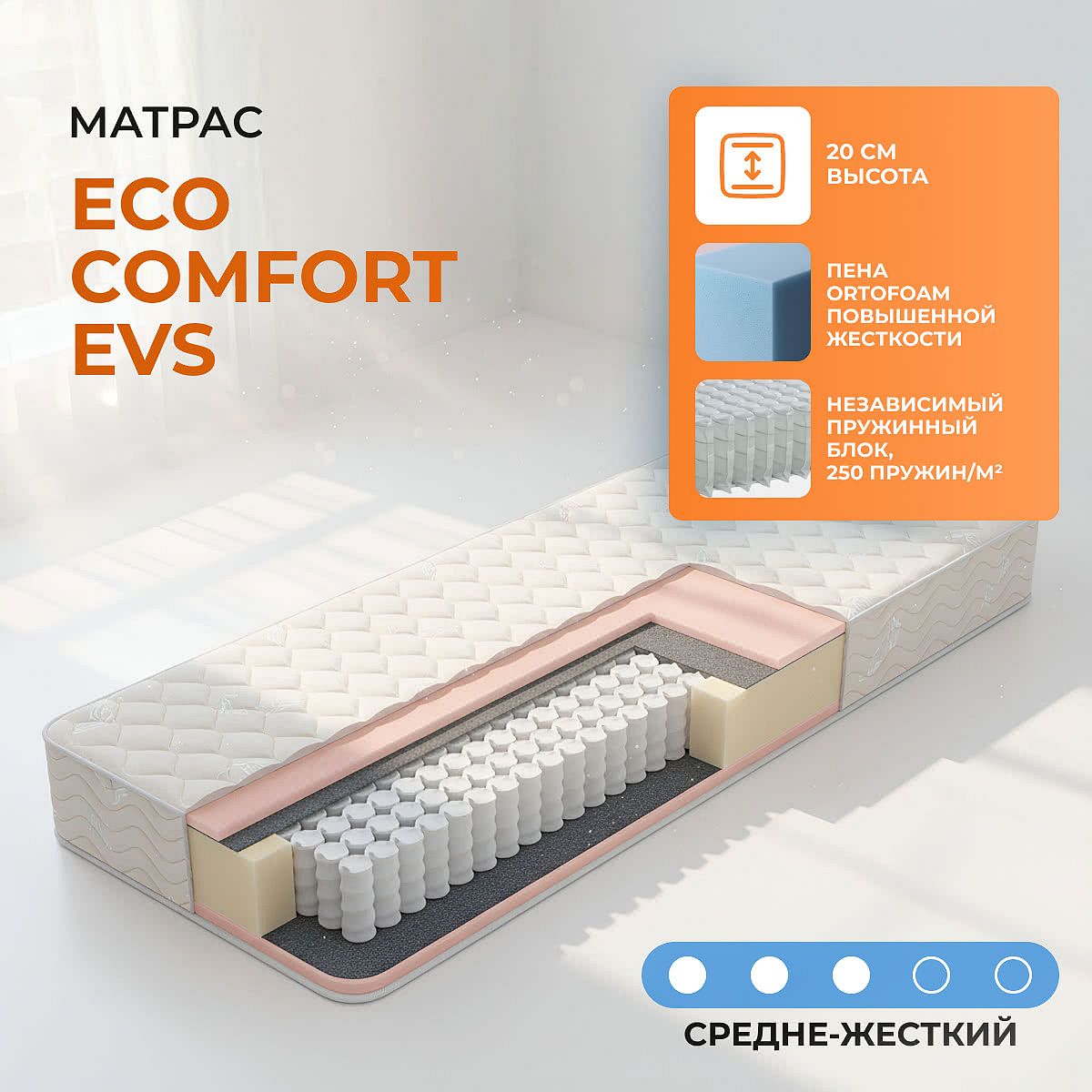 Матрас «Eco Comfort EVS» — средней жесткости, которая комфортна большинству людей среднего телосложения. Это — универсальный вариант и детям, и взрослым, и пожилым людям.