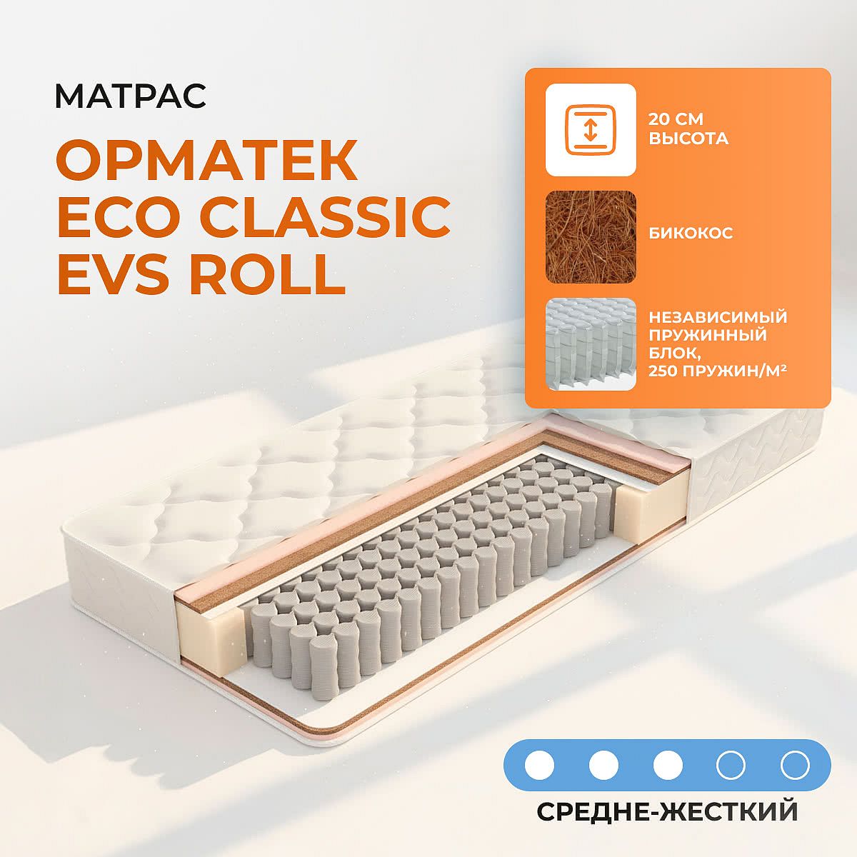 Матрас «Орматек Eco Classic EVS Roll» — средней жесткости, которая комфортна большинству людей среднего телосложения. Это — универсальный выбор и детям, и взрослым, и пожилым людям.
