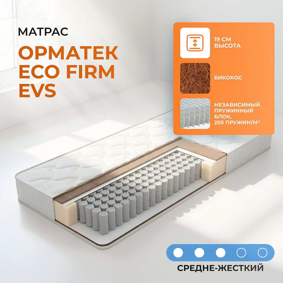 Умеренно-жесткий матрас Firm обеспечивает надежную поддержку вашего тела во время сна и отдыха. В основе модели современный блок EVS 500, где на каждый квадратный метр приходится 250 автономно работающих пружин, благодаря чему матрас становится более плотным, эластичным и гибким. Комфортные слои выполнены из материала на основе натурального кокосового волокна, хорошо пропускают воздух и создают оптимальный микроклимат спального места.Состав матраса: