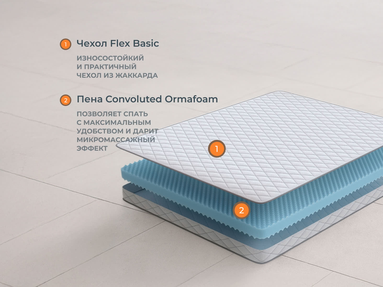 изготовленных в соответствии с европейскими стандартами качества пен.Матрас Flex Basic – базовый беспружинный матрас для правильного сна и отдыха по доступной цене. Матрас хорошо переносит перепад температуры в холодный сезон и подходит для использования на даче. Беспружинный матрас с жесткостью ниже средней, изготовлен на основе современного материала Ormafoam с рельефной поверхностью, которая оказывает легкий массажный эффект и улучшает кровообращение. Для удобства транспортировки матрас скручен в рулон и помещен в вакуумную упаковку. Cрок хранения в скрученном виде не должен превышать 180 дней с даты выпуска. Состав матраса
