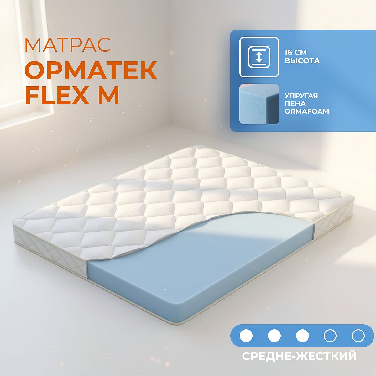 Матрас «Орматек Flex M» — средней жесткости, которая подходит большинству людей среднего телосложения. Это — универсальный вариант и детям, и взрослым, и пожилым людям.