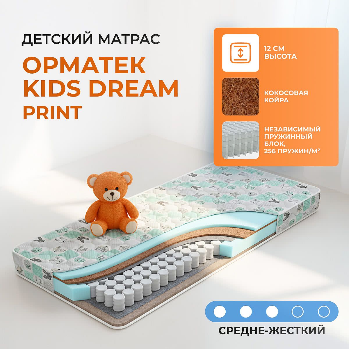 Матрас «Орматек Kids Dream (Print)» — средней жесткости, которая комфортна большинству людей среднего телосложения. Это — оптимальный выбор и детям, и взрослым, и пожилым людям.