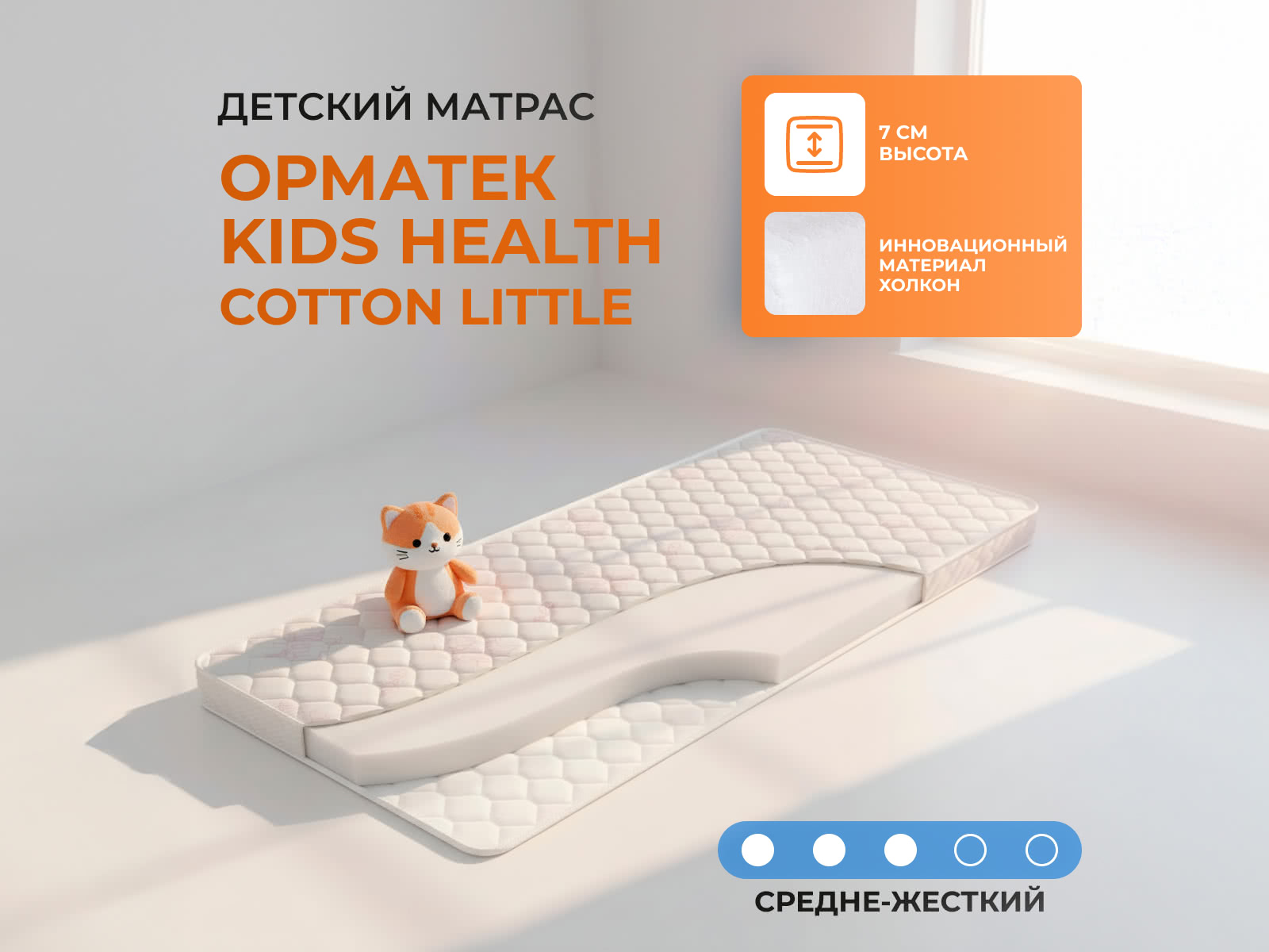 Матрас «Орматек Kids Health (Cotton Little)» — средней жесткости, которая комфортна большинству людей среднего телосложения. Это — оптимальный вариант и детям, и взрослым, и пожилым людям.