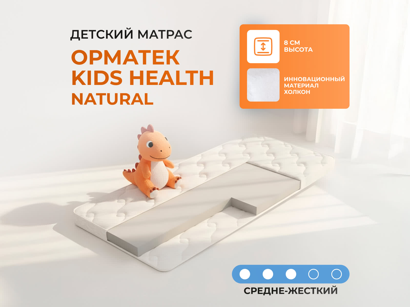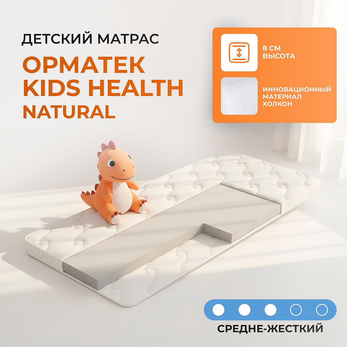 Матрас «Орматек Kids Health (Natural)» — средней жесткости, которая подходит большинству людей среднего телосложения. Это — универсальный вариант и детям, и взрослым, и пожилым людям.
