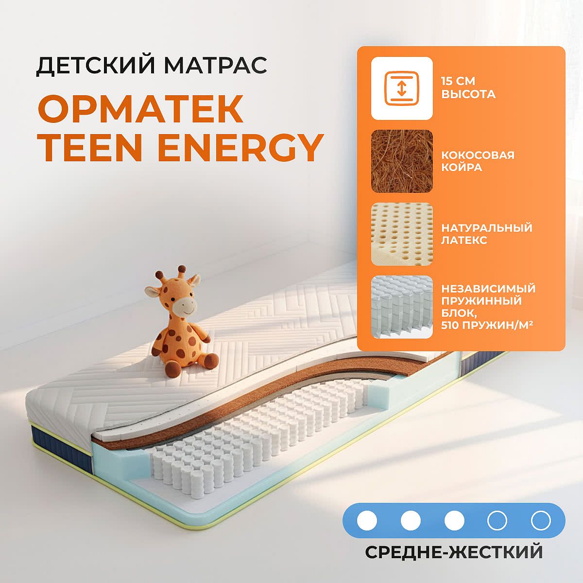 Матрас «Орматек Teen Energy» — средней жесткости, которая подходит большинству людей среднего телосложения. Это — оптимальный вариант и детям, и взрослым, и пожилым людям.