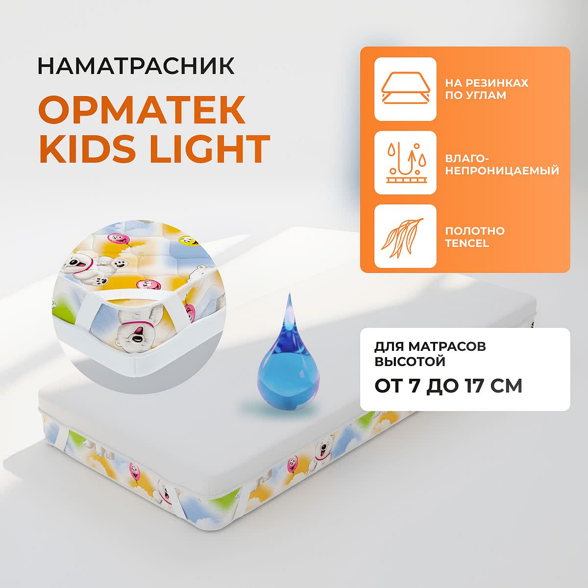 Использование чехла Орматек Kids Light является идеальной защитой, препятствуя загрязнению вашего матраса, размножению микроорганизмов, развитию аллергических реакций.Состав чехла: верх - полотно Tencel (100% tencel), нижняя часть материала обработана специальным влагонепроницаемым покрытием, для крепления на матрасе чехол по низу борта имеет резинку. Наматрасник удобен в эксплуатации: его можно стирать в обычной стиральной машине даже на максимальной температуре, он легко одевается и снимается с матраса, имеет долгий срок службы и привлекательный внешний вид. Рекомендуемая высота матраса: от 7 до 17 см. При покупке этого наматрасника вместе с матрасом Орматек серии Kids гарантия на матрас увеличивается до 5 лет.