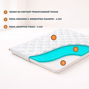 Нижняя пласть чехла выполнена из прочной воздухопроницаемой белой 3D сетки. Обеспечивает отличную циркуляцию воздуха, эффективно отводит влагу. Высота топпера – 10 см. Имеет четыре удобных и надежных резинки по углам для фиксации топпера на матрасе. Рекомендуемая высота матраса: 15-27 см. Для удобства транспортировки скручен в рулон и помещен в вакуумную упаковку.