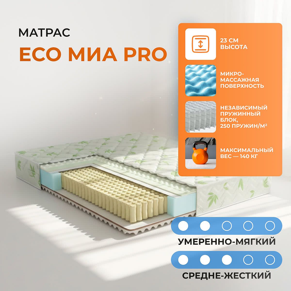 Матрас Eco МИА Pro — это современный пружинный матрас с разной жесткостью сторон, который обеспечивает комфортный сон и адаптацию под индивидуальные предпочтения. Одна сторона матраса — умеренно мягкая, другая — средней жесткости, что позволяет выбрать подходящий уровень поддержки. Высота матраса составляет 23 см, а максимальная нагрузка на спальное место — до 140 кг, что делает модель удобной для большинства пользователей, включая пары с разницей в весе. В основе матраса — независимый пружинный блок EVS500 с плотностью 250 пружин на м2. Такой блок обеспечивает точечную поддержку и равномерное распределение нагрузки, позволяя избежать эффекта «волны» при смене положения тела. Слои Ortofoam с ячеистой структурой способствуют лёгкому микромассажу и расслаблению, а дополнительный слой кокосовой койры на одной из сторон придаёт матрасу дополнительную упругость и долговечность. Чехол выполнен из мягкого трикотажа Aloe Vera, простёганного на объёмном волокне толщиной 2,5 см. Ткань приятна на ощупь и способствует расслаблению во время сна. Характеристики