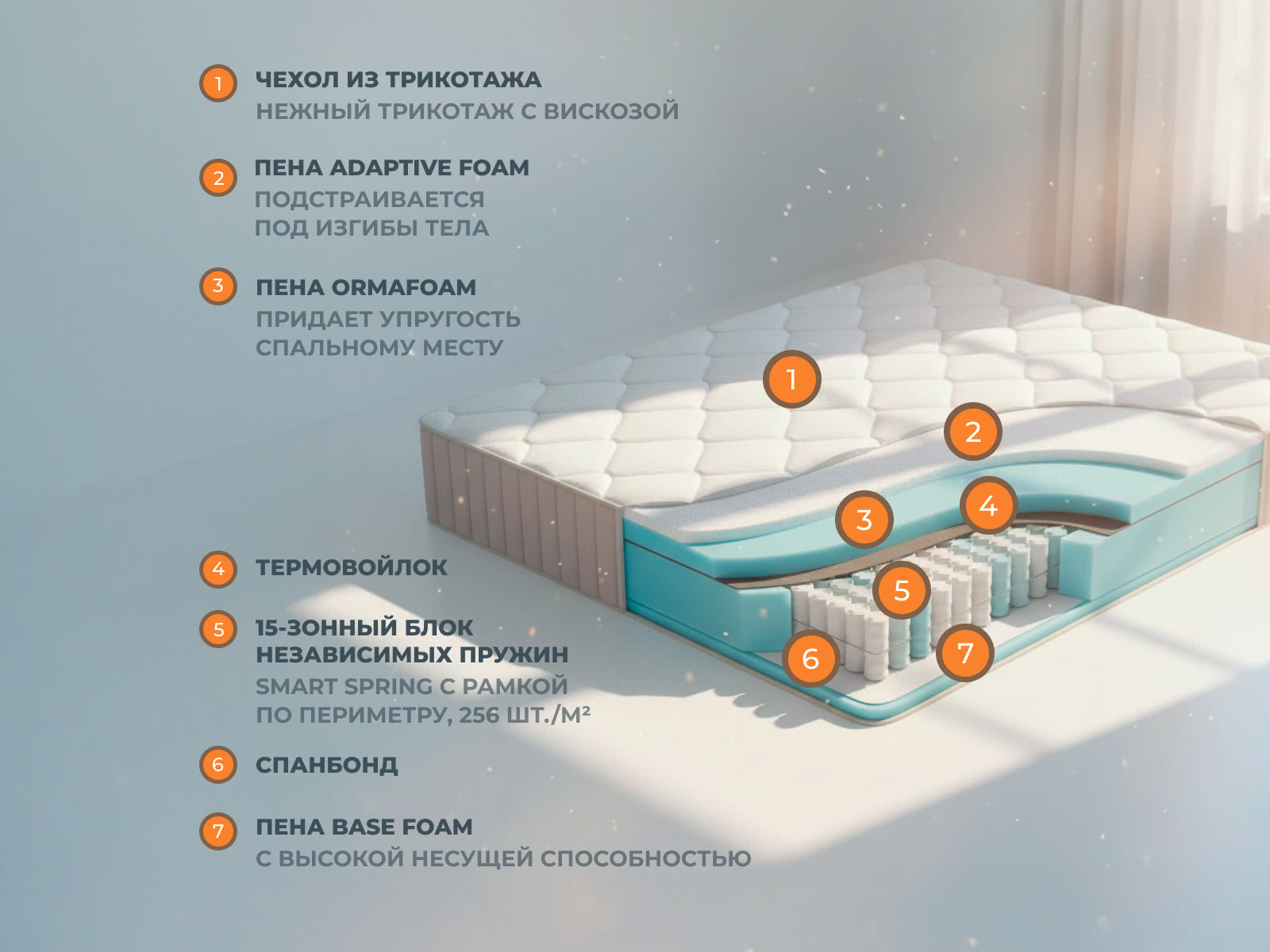 Допустимая разница в весе: 30 кг. Высота матраса: 27 см. Мягкий чехолНежный трикотаж с вискозой, простеганный на эластичной пене и объемном синтепоне. Тактильный контакт с тканью оставляет исключительно приятные ощущения – она мягкая, нежная и шелковистая. Трикотаж с вискозой обладает свойством терморегуляции, что особенно важно для комфортного сна круглый год: прохладно летом и тепло зимой.Вискоза в составе дарит особую мягкость и нежность при прикосновении, хорошо пропускает воздух, позволяя коже дышать, не накапливает статическое электричество. Состав ткани: 38% вискозы + 62% полиэстер. Наполнитель: гипоаллергенное волокно 370 г/м2 + Ormafoam 1 cм. Бурлет из долговечной ткани Diva Тауп нюд. Низ из стеганой ткани Молимо. Бурлет из износостойкой мебельной ткани защищает матрас от истирания при соприкосновении с бортиком кровати. Универсальный бежевый цвет подойдет к большинству исполнений кроватей. Пружинный блок Smart SpringБлок пружин состоит из 15 зон жесткости, которые подстраиваются под изгибы с учетом строения тела человека.