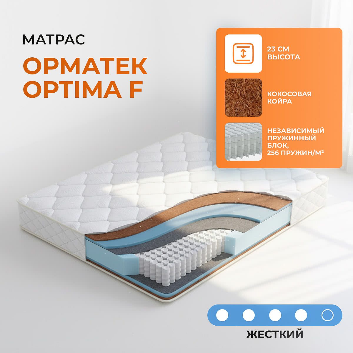 Матрас высокой жесткости «Орматек Optima F» — оптимальный выбор для уверенной поддержки позвоночника. Именно такие модели обычно рекомендуют подросткам, спортсменам или людям с проблемами позвоночника.