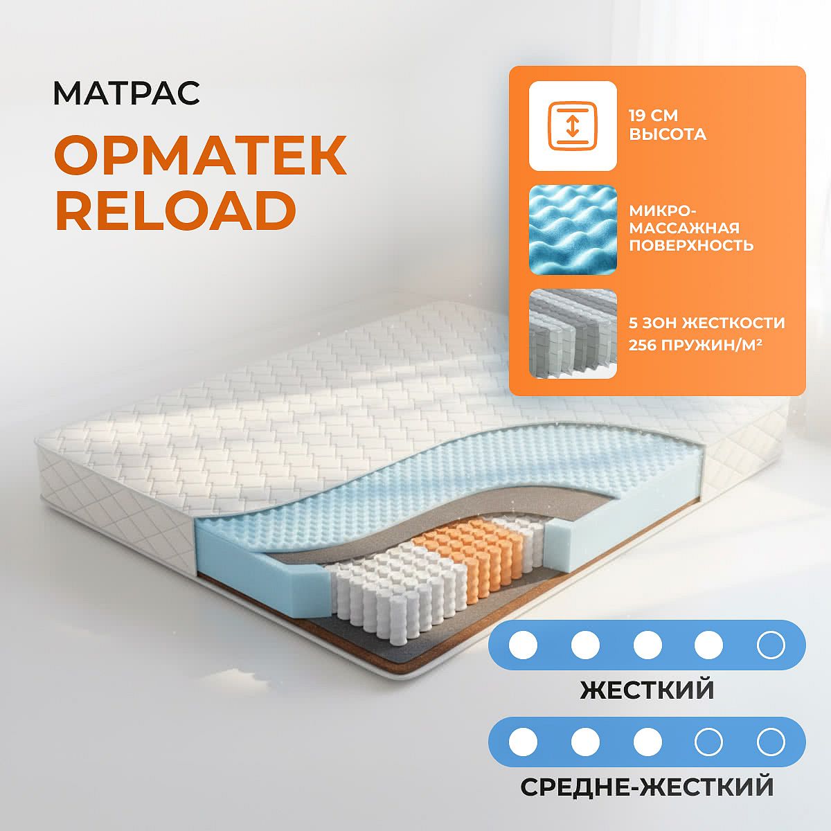 Преимущество матраса Reload — он имеет 2 различные по жесткости стороны: средне-жесткую и жесткую.
