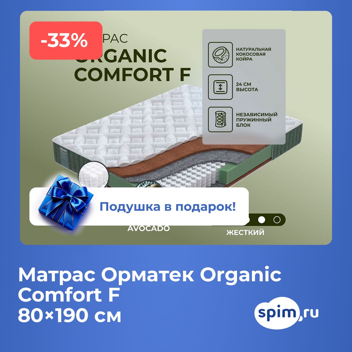 Матрас высокой жесткости «Орматек Organic Comfort F» — оптимальный выбор для уверенной поддержки позвоночника. Именно такие модели обычно рекомендуют подросткам, спортсменам или людям с проблемами позвоночника.