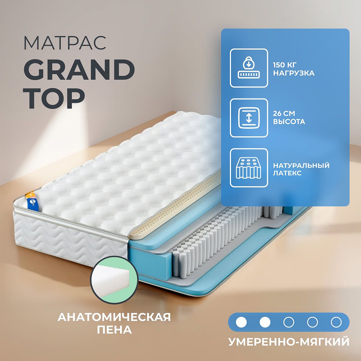 Матрас GrandTop имеет среднюю толщину и подходит к большинству типов кроватей.