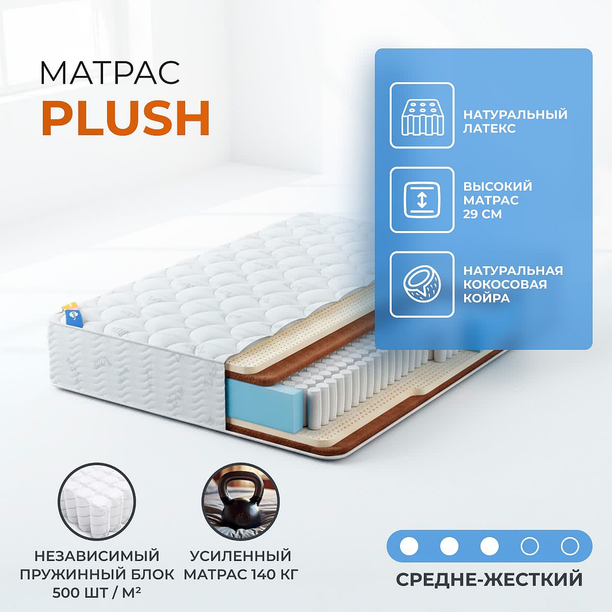 Матрас Plush - матрас средней жесткости с разной упругостью сторон, которая достигается асимметричной комбинацией натурального латекса и кокосовой койры. Таким образом, одна сторона более ровная и упругая, другая - более мягкая и эластичная.В основе матраса - независимая пружинная основа с плотностью пружин 1000 шт/спальное место. Такой пружинный блок оптимальным образом сочетает: