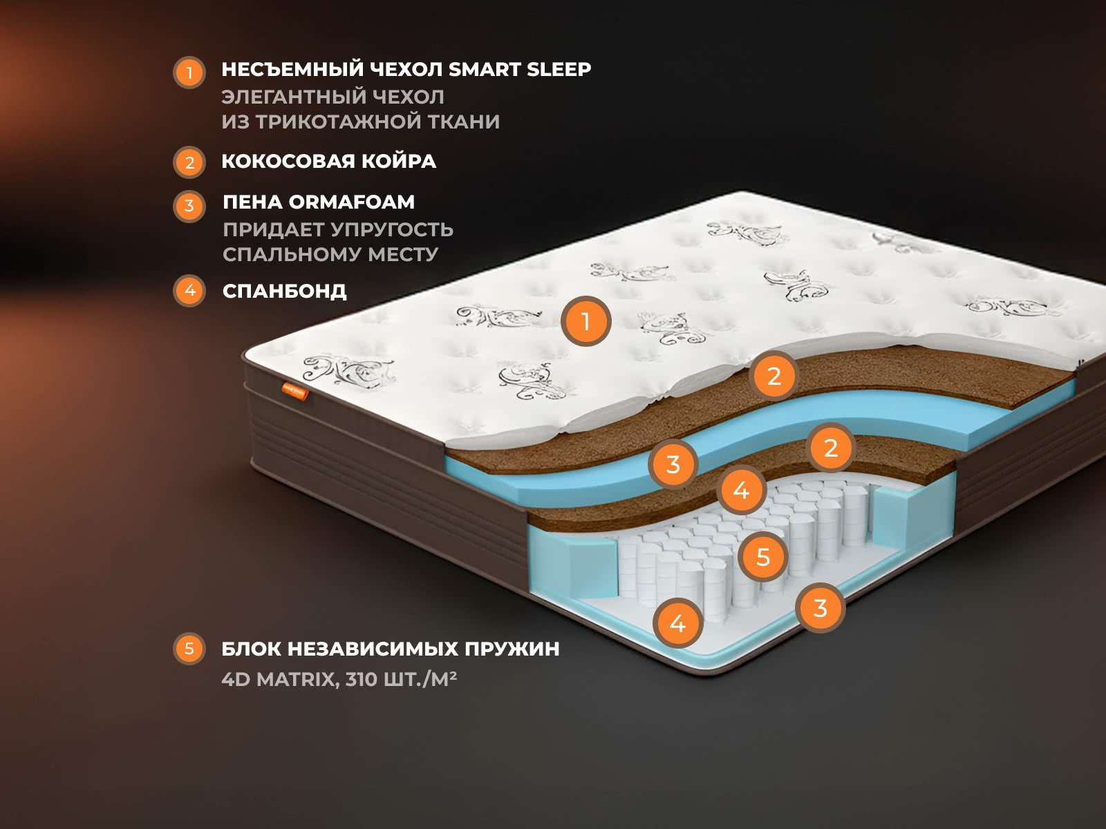 Жесткий односторонний матрас. Не требует переворачивания.Состав: