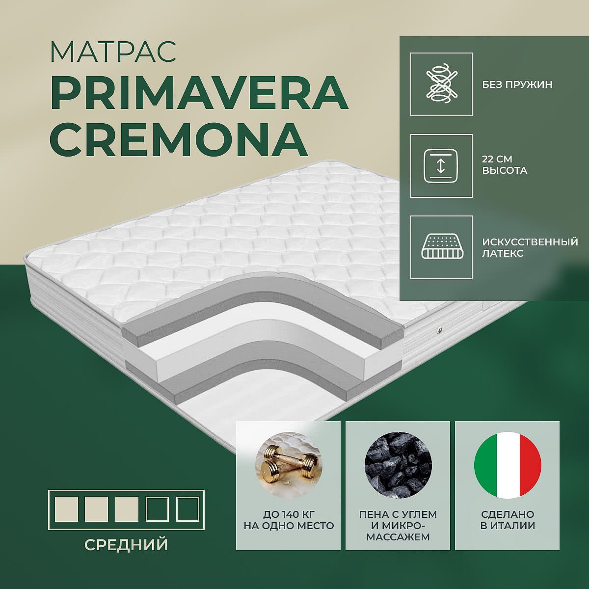 Матрас «Primavera Cremona» — средней жесткости, которая подходит большинству людей среднего телосложения. Это — универсальный выбор и детям, и взрослым, и пожилым людям.