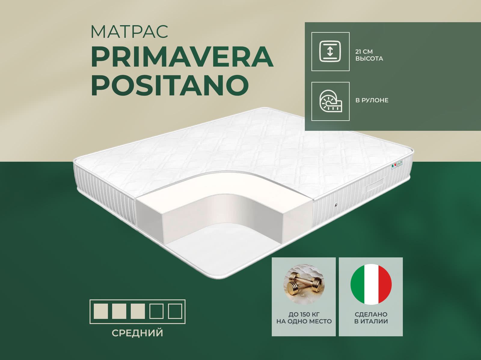 Матрас «Primavera Positano» — средней жесткости, которая подходит большинству людей среднего телосложения. Это — оптимальный вариант и детям, и взрослым, и пожилым людям.