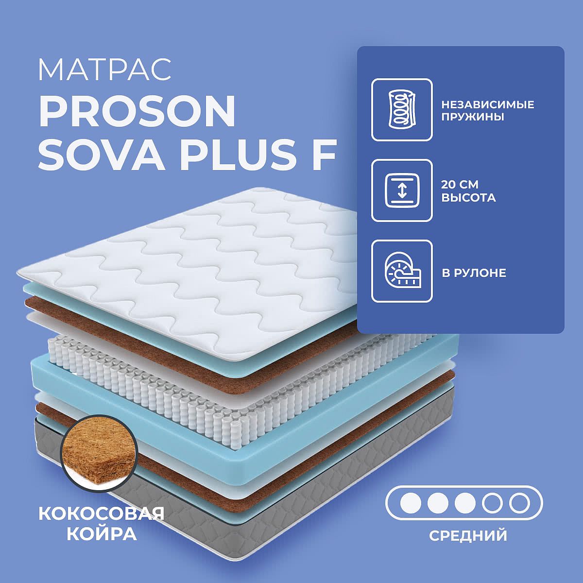 Матрас «ProSon Sova Plus F» — средней жесткости, которая подходит большинству людей среднего телосложения. Это — универсальный выбор и детям, и взрослым, и пожилым людям.