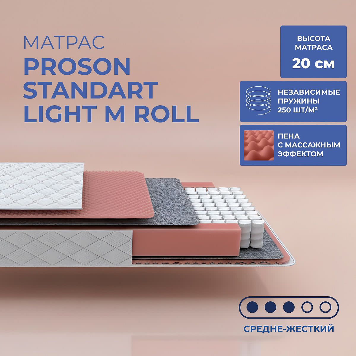 Матрас «ProSon Standart Light M Roll» — средней жесткости, которая подходит большинству людей среднего телосложения. Это — оптимальный выбор и детям, и взрослым, и пожилым людям.