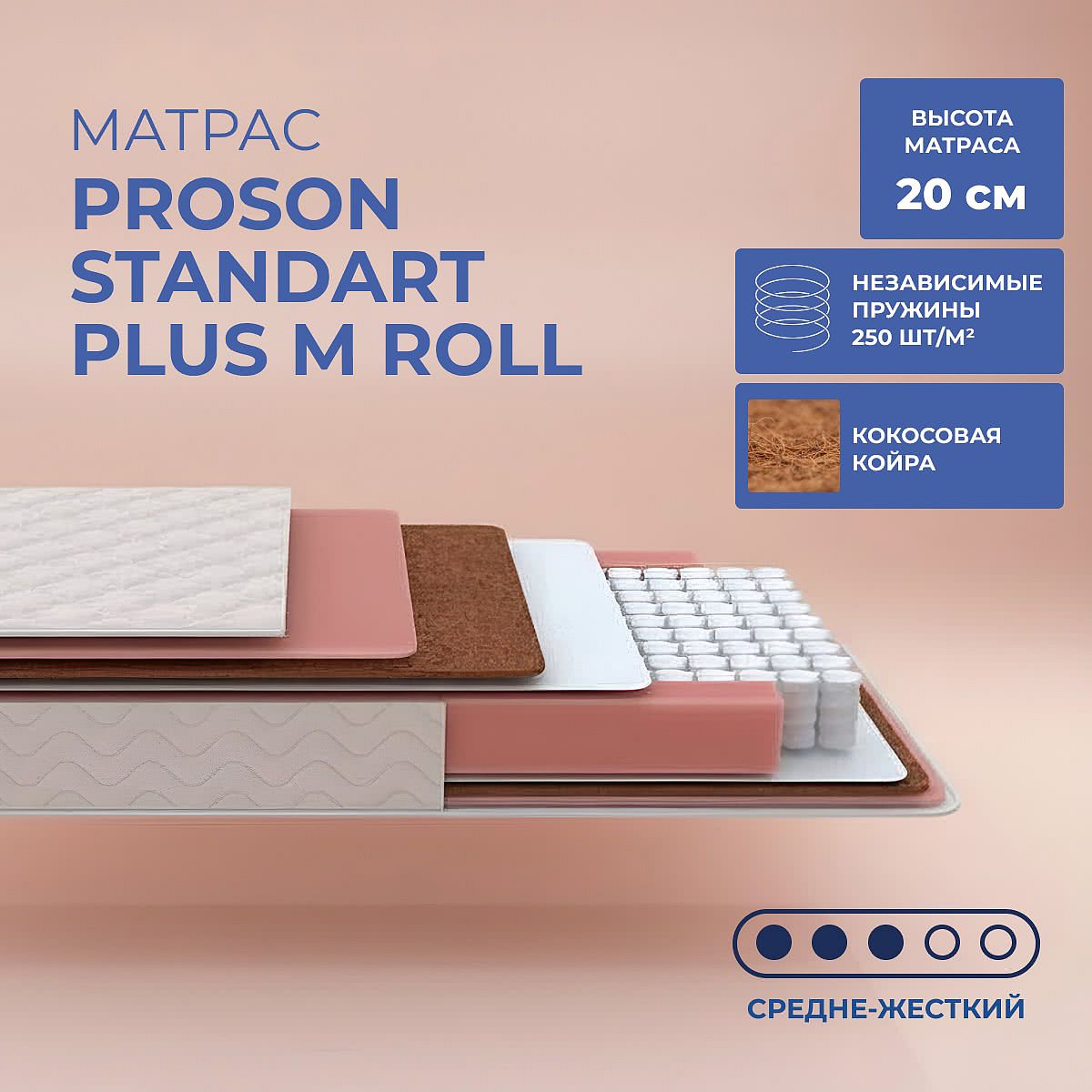 Матрас «ProSon Standart Plus M Roll» — средней жесткости, которая подходит большинству людей среднего телосложения. Это — оптимальный выбор и детям, и взрослым, и пожилым людям.