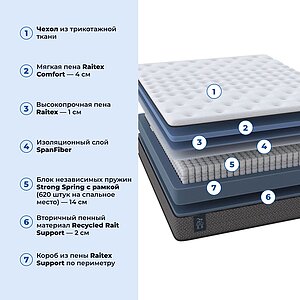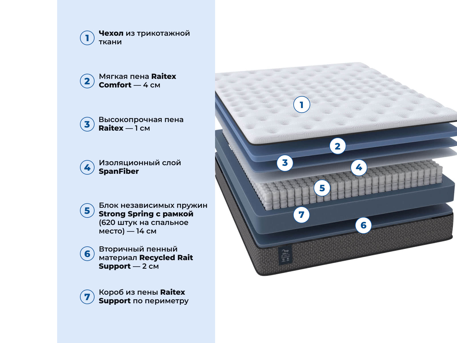 Самый мягкий односторонний матрас в линейке. Благодаря сочетанию мягкой пены Raitex Comfort и эластичной пены Ratex, матрас одновременно дарит ощущения мягкости и надежной поддержки. А за равномерное распределение нагрузки на матрас отвечает блок независимых пружин Strong Spring в основе матраса. Состав матраса: