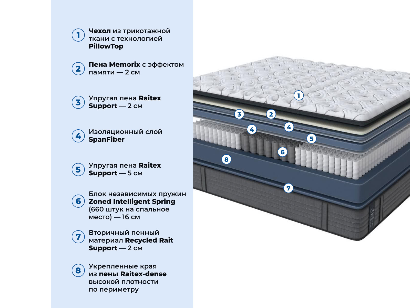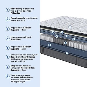 Односторонний матрас премиального уровня комфорта, обладающий средним уровнем жесткости. Инновационная пена с эффектом «памяти» Memorix прекрасно подстраивается под тело спящего, а пена средней плотности Raitex Support обеспечивает поддержку и среднюю жесткость матрасу. Состав матраса: