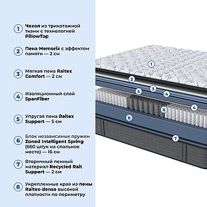 Самый мягкий односторонний матрас в линейке. Обладает эффектом «обволакивания» благодаря сочетанию инновационной пены с эффектом «памяти» Memorix и мягкой пены Raitex Comfort. При этом обеспечивать надежную поддержку помогает пена средней плотности Raitex Support и система независимых пружин Zoned Intelligent Spring.Состав матраса: