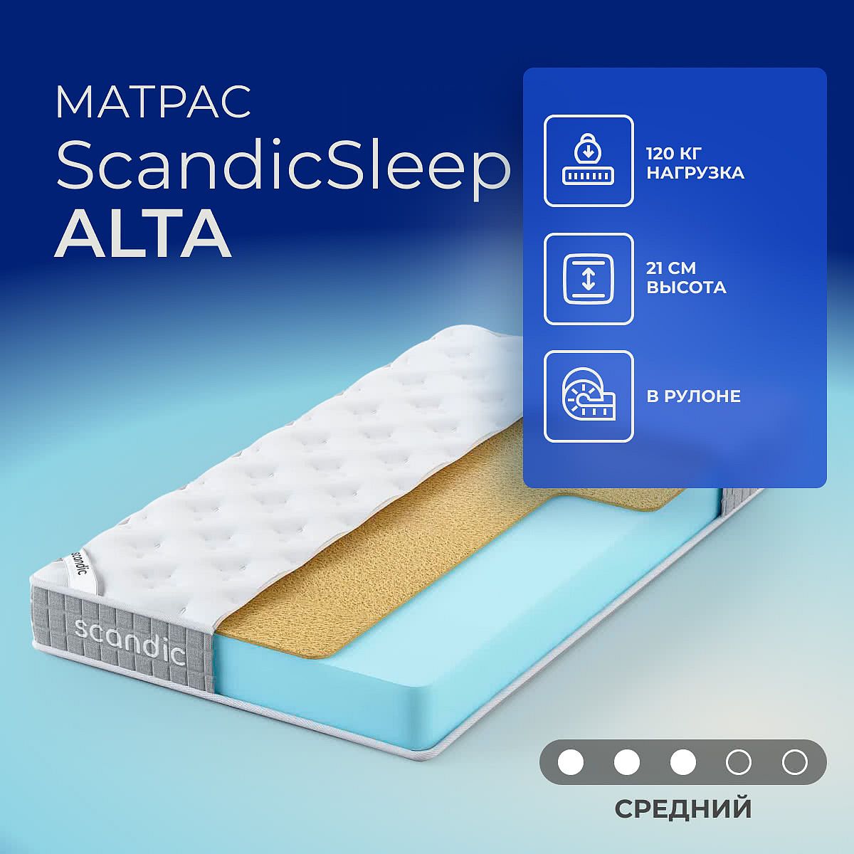 Матрас «ScandicSleep Alta» — средней жесткости, которая комфортна большинству людей среднего телосложения. Это — оптимальный вариант и детям, и взрослым, и пожилым людям.